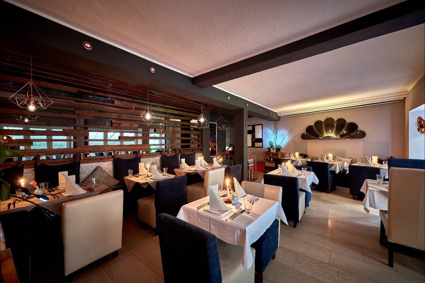 "Bartheke, Lampen und Stühle – vor einer dunklen, raffiniert gespachtelten Wand, viele Kissen und ein Weinregal, in dem die Flaschen zu schweben scheinen. Wenn es auf dem Teller ebenso geschmackvoll zugeht wie bei der Einrichtung, ist das vielversprechend …"